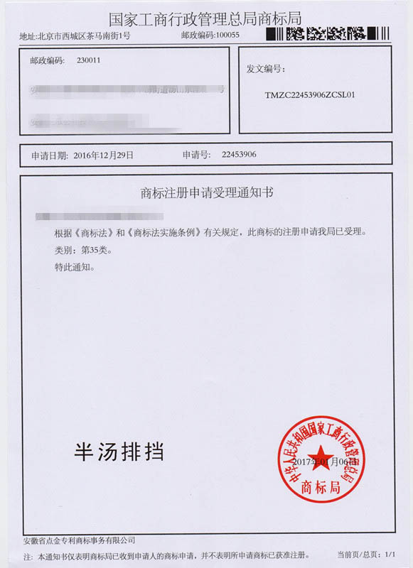 第35类“半汤排挡”商标受理通知书