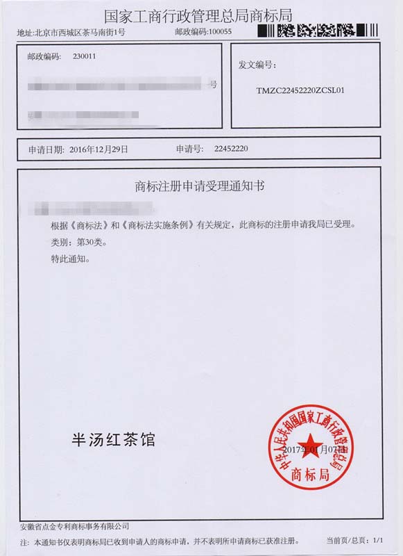 第30类“半汤红茶馆”商标受理通知书
