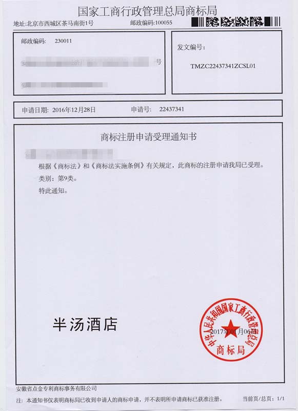 第9类“半汤酒店”商标受理通知书