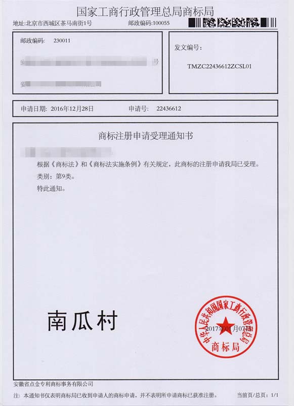 第9类“南瓜村”商标受理通知书