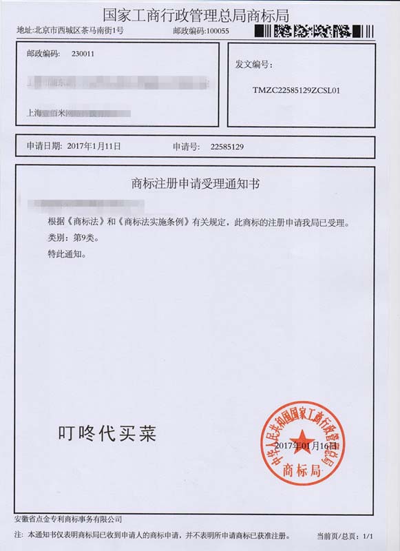 第9类“叮咚代买菜”商标受理通知书