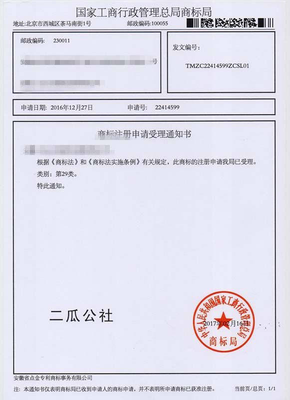 第29类“二瓜公社”商标受理通知书