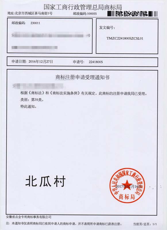 第35类“北瓜村”商标受理通知书