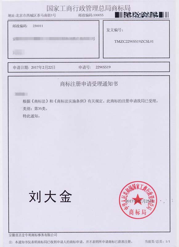 第35类“刘大金”商标受理通知书