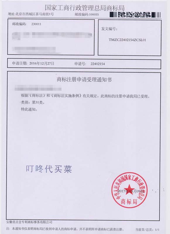 第31类“叮咚代买菜”商标受理通知书