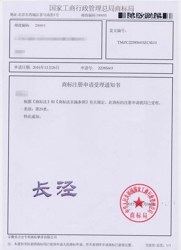第25类“长泾”商标受理通知书
