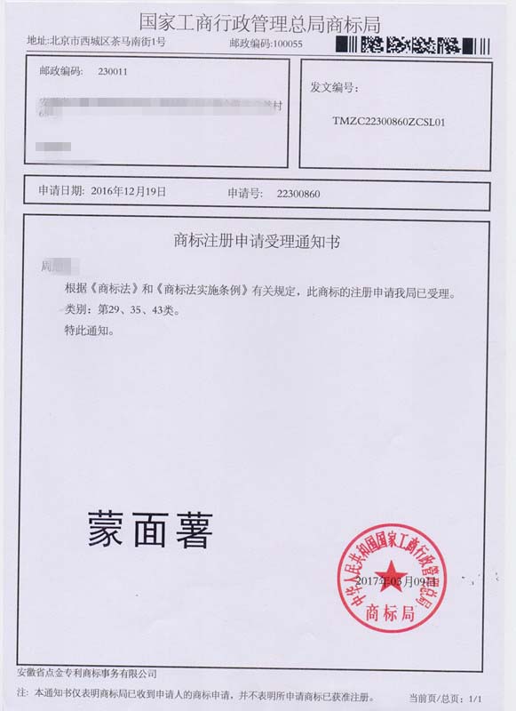 第29、35、43类“蒙面薯”商标受理通知书