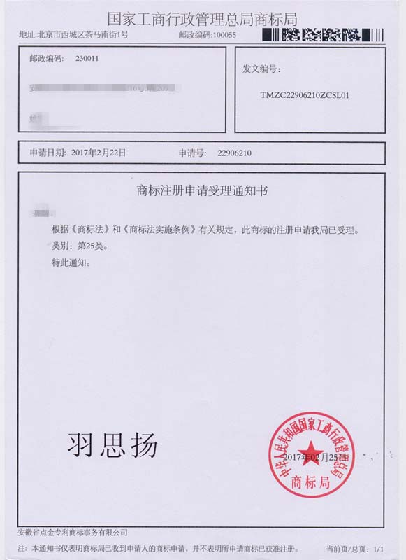 第25类“羽思扬”商标受理通知书