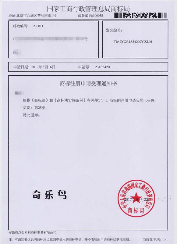 第25类“奇乐鸟”商标受理通知书