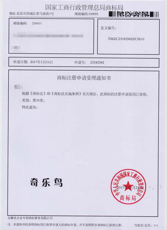 第35类“奇乐鸟”商标受理通知书
