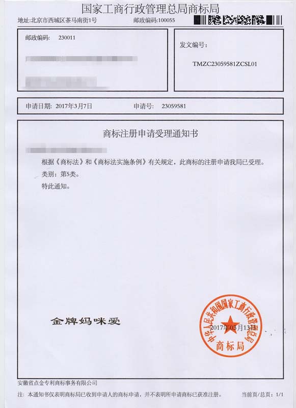第5类“金牌妈咪”商标受理通知书