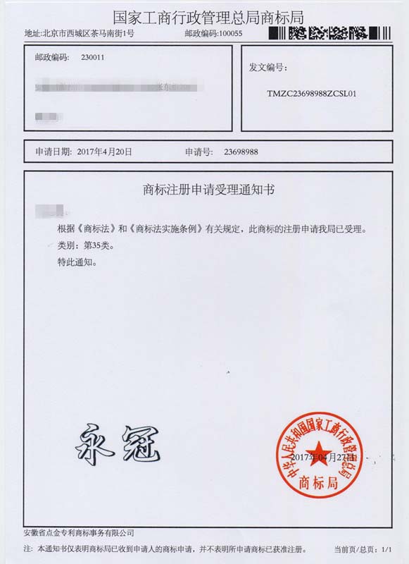第35类“永冠”商标受理通知书
