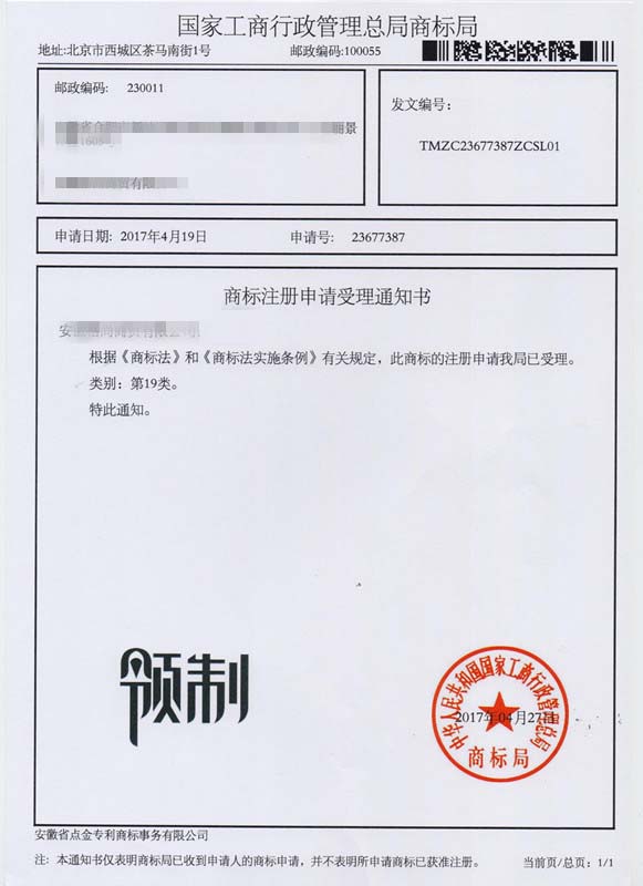 第19类“领制”商标受理通知书