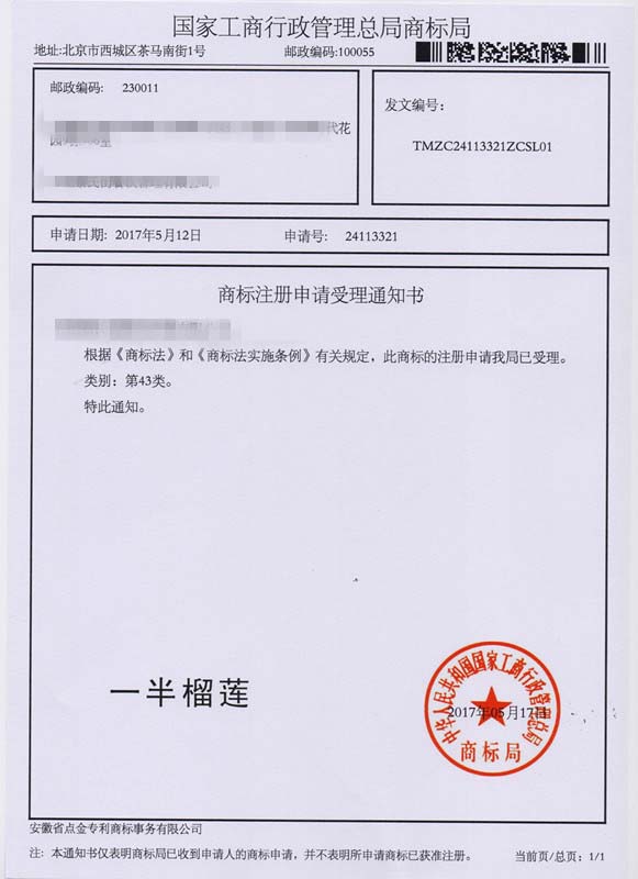 第43类“一半榴莲”商标受理通知书