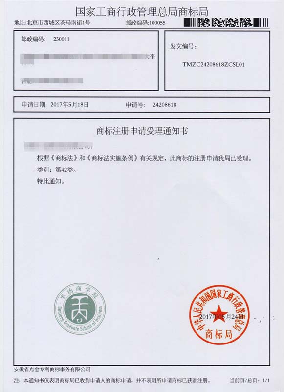 第42类“半汤商学院”商标受理通知书