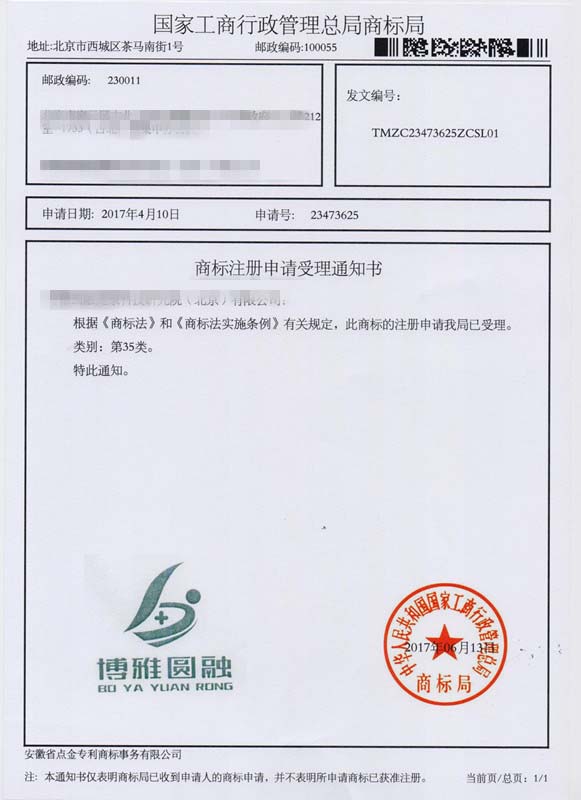 第35类“博雅圆融”商标受理通知书