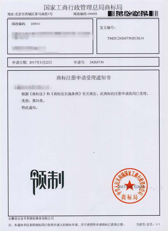 第25类“领制”商标受理通知书