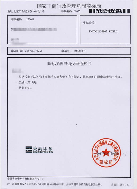 第11类“美高印象”商标受理通知书