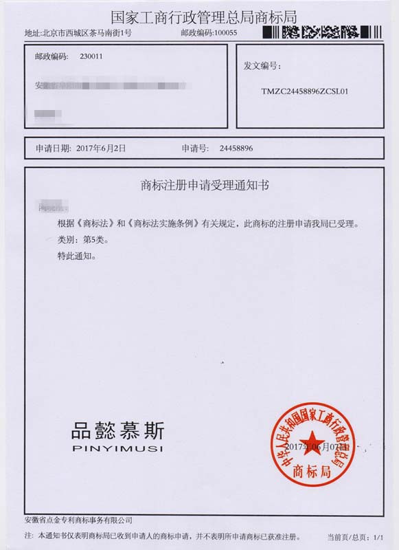 第5类“品懿慕斯”商标受理通知书