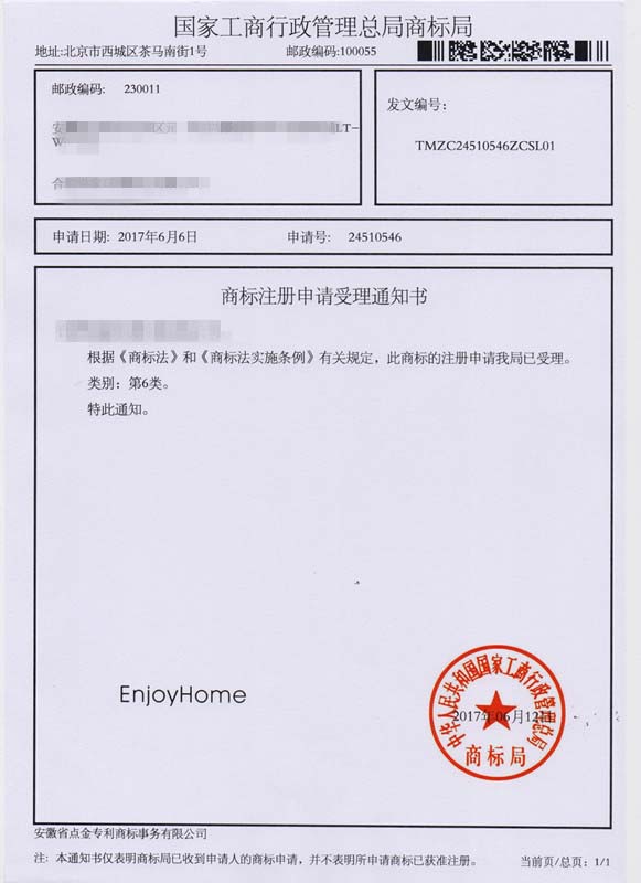 第6类“EnjoyHome”商标受理通知书