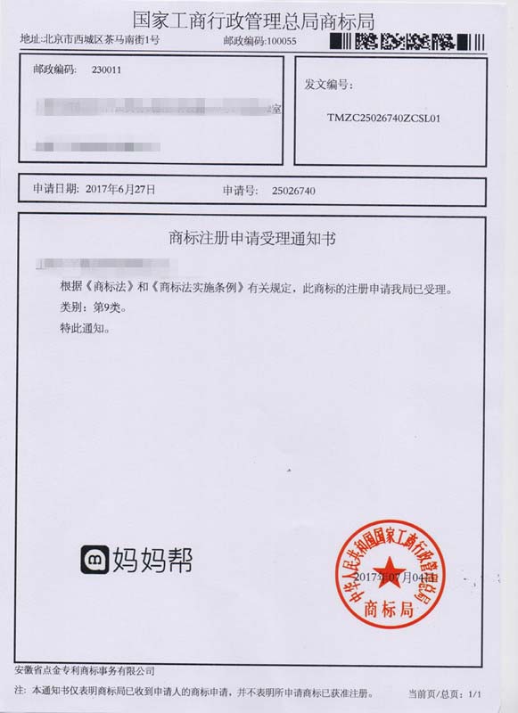 第9类“妈妈帮”商标受理通知书