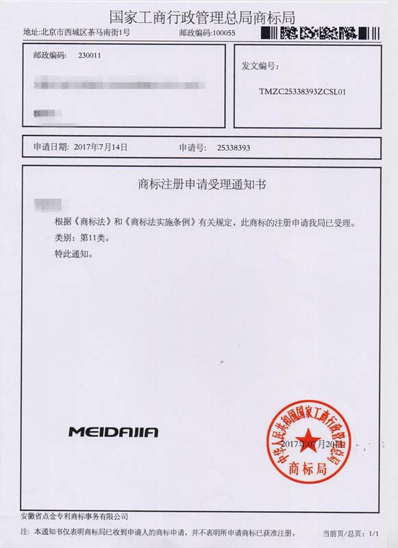 第11类“MEIDAJIA”商标受理通知书