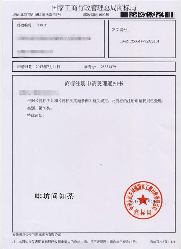 第30类“啡坊间知茶”商标受理通知书