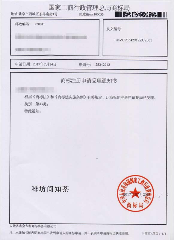 第43类“啡坊间知茶”商标受理通知书