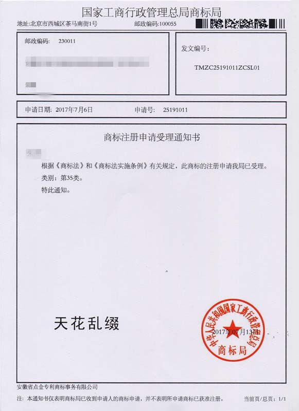 第35类“天花乱缀”商标受理通知书