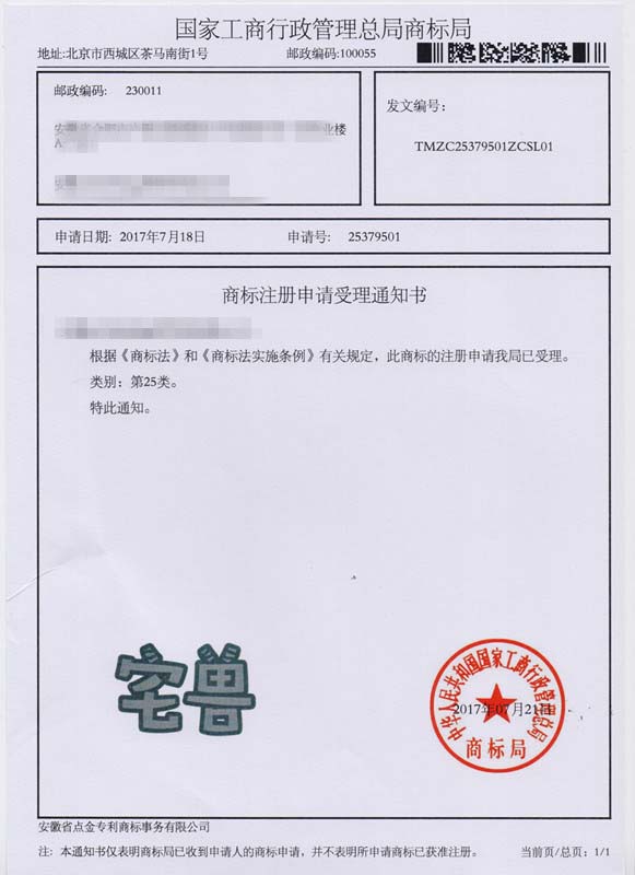 第25类“宅兽”商标受理通知书
