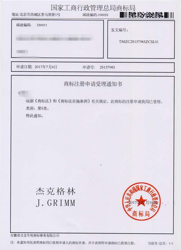 第5类“杰克格林”商标受理通知书