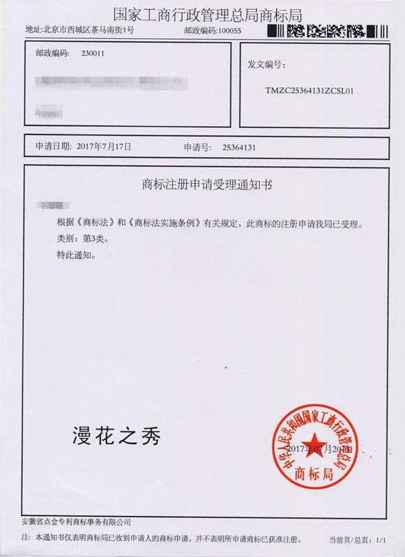 第3类“漫花之秀”商标受理通知书