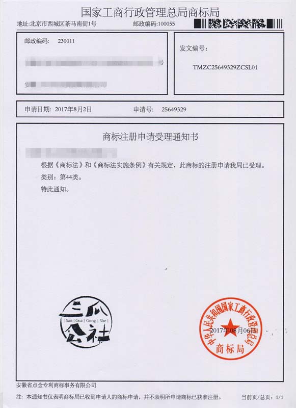 第44类“三瓜公社 SAN GUA GONG SHE”商标受理通知书