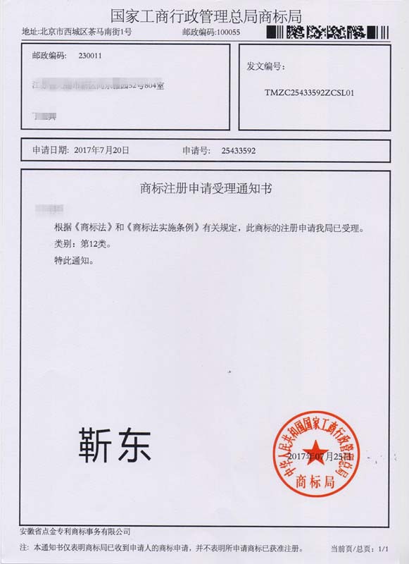第12类“靳东”商标受理通知书