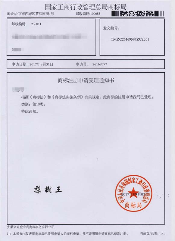 第19类“梨樹王”商标受理通知书