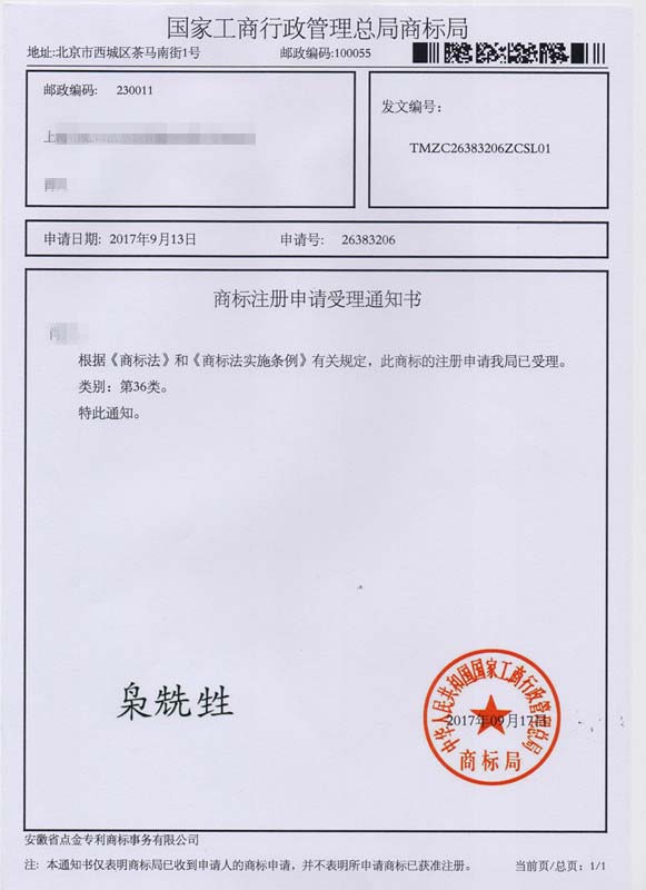 第36类“枭兟甡”商标受理通知书