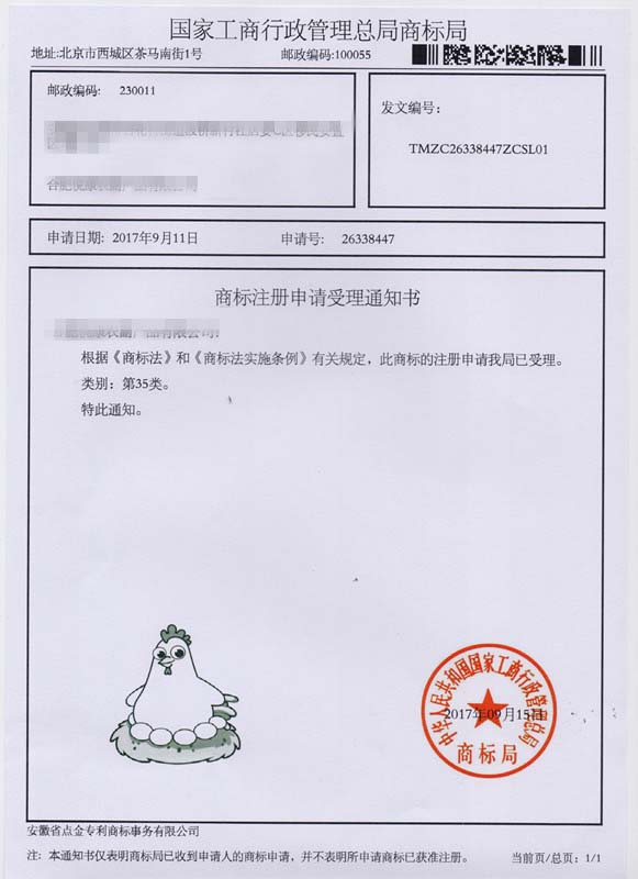 第35类“鸡图形”商标受理通知书