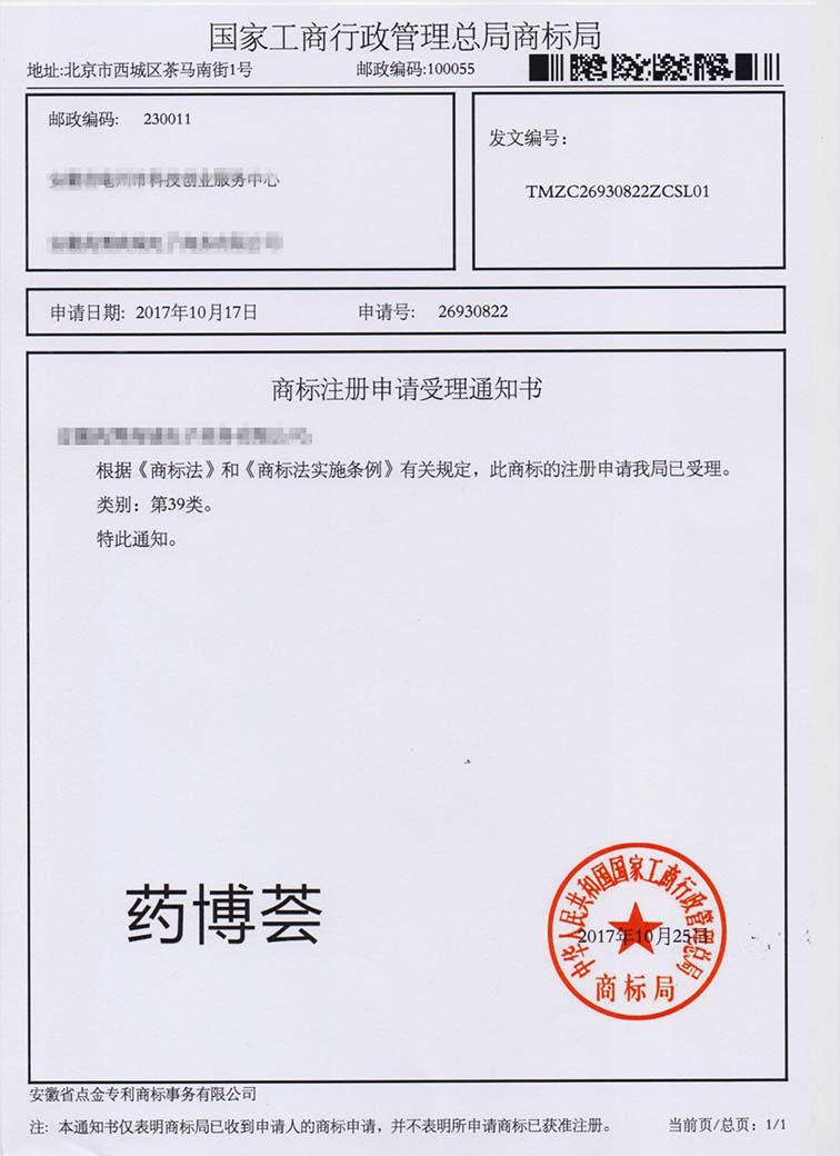 第39类“药博荟”商标受理通知书