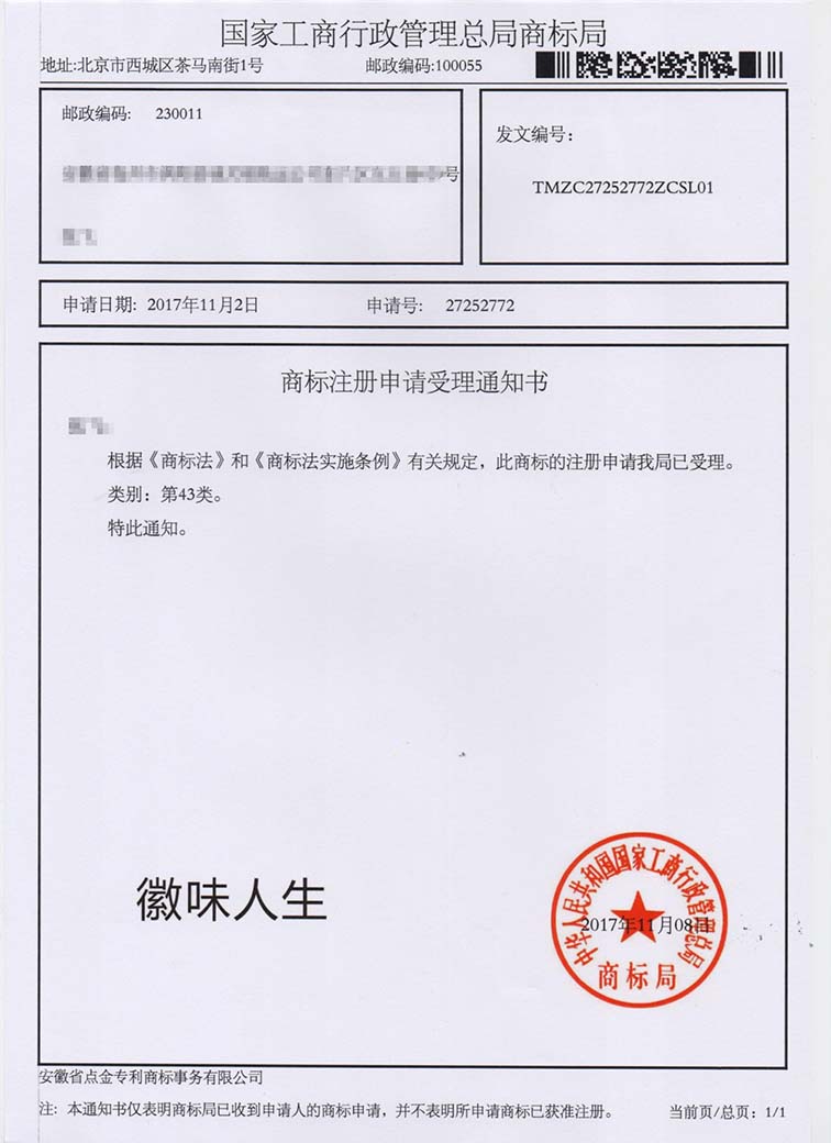 第43类“徽味人生”商标受理通知书