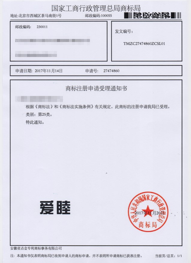 第25类“爱睦”商标受理通知书