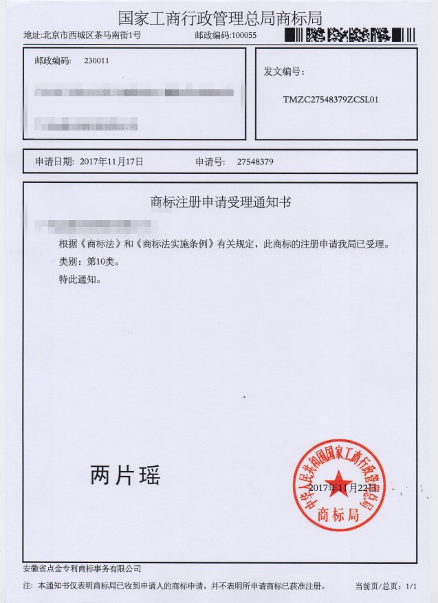 第10类“两片瑶”商标受理通知书