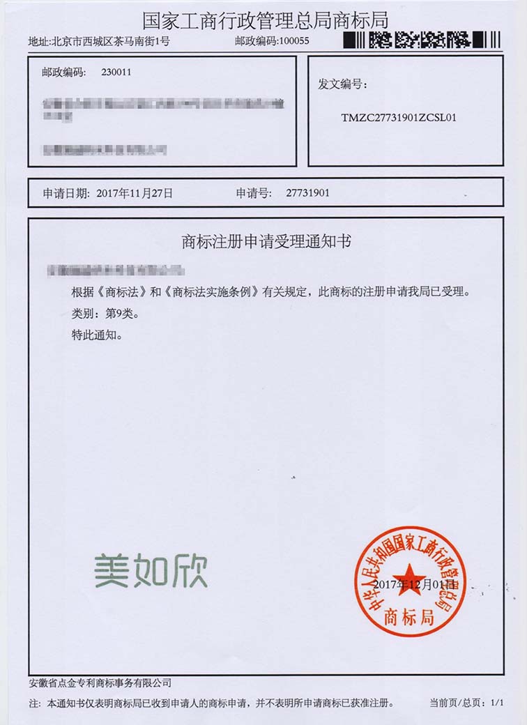 第9类“美如欣”商标受理通知书