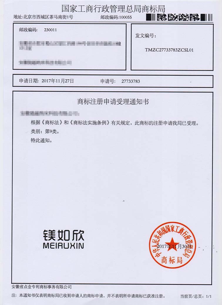 第9类“镁如欣”商标受理通知书