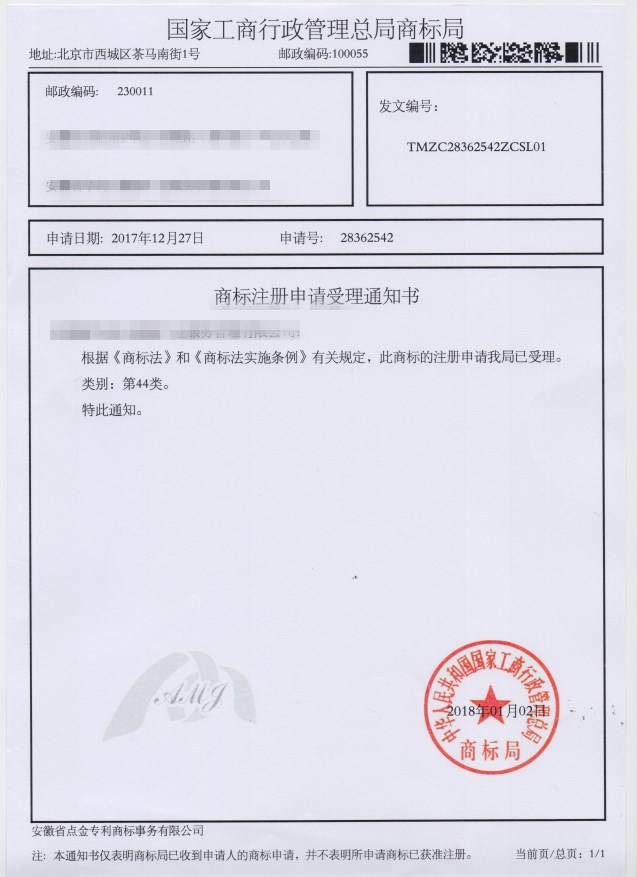第44类“AMG”商标受理通知书