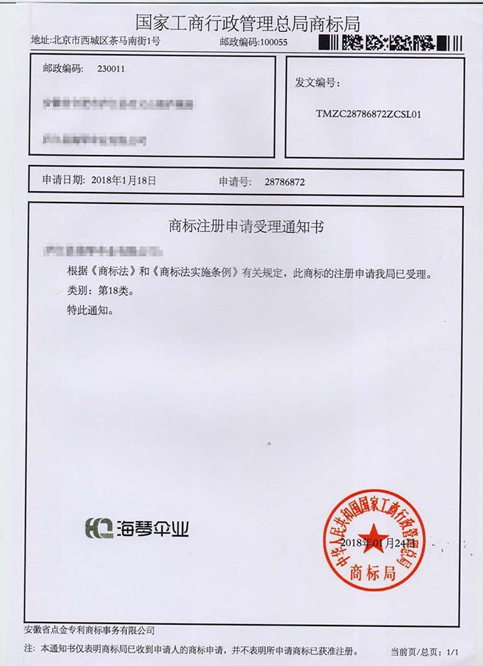 第18类“海琴伞业”及图形商标受理通知书