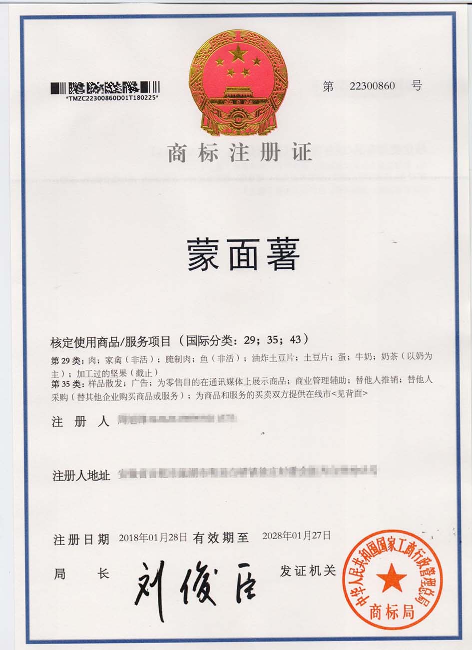 第29、35、43类“蒙面薯”商标注册证