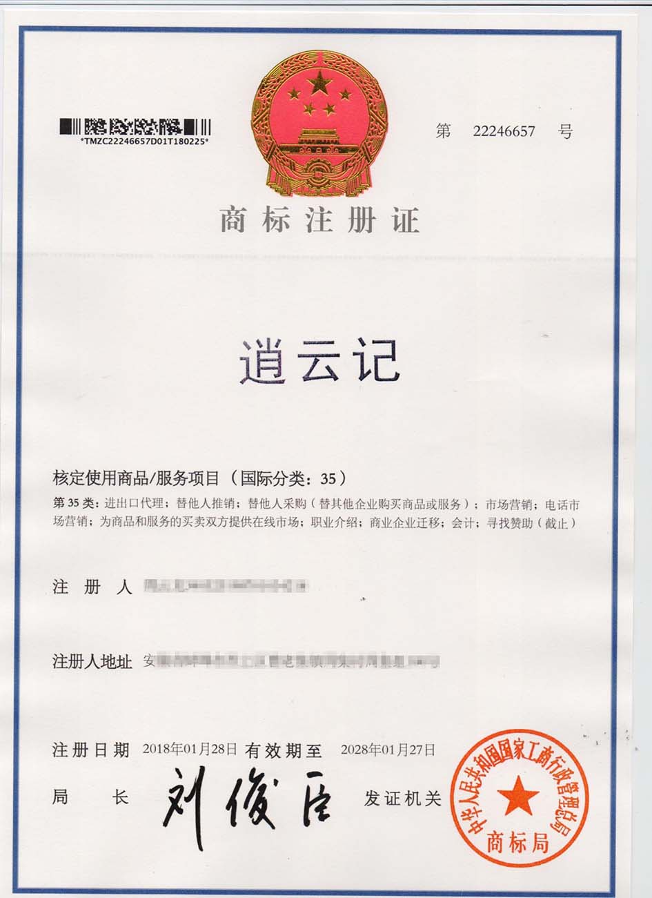 第35类“逍云记”商标注册证