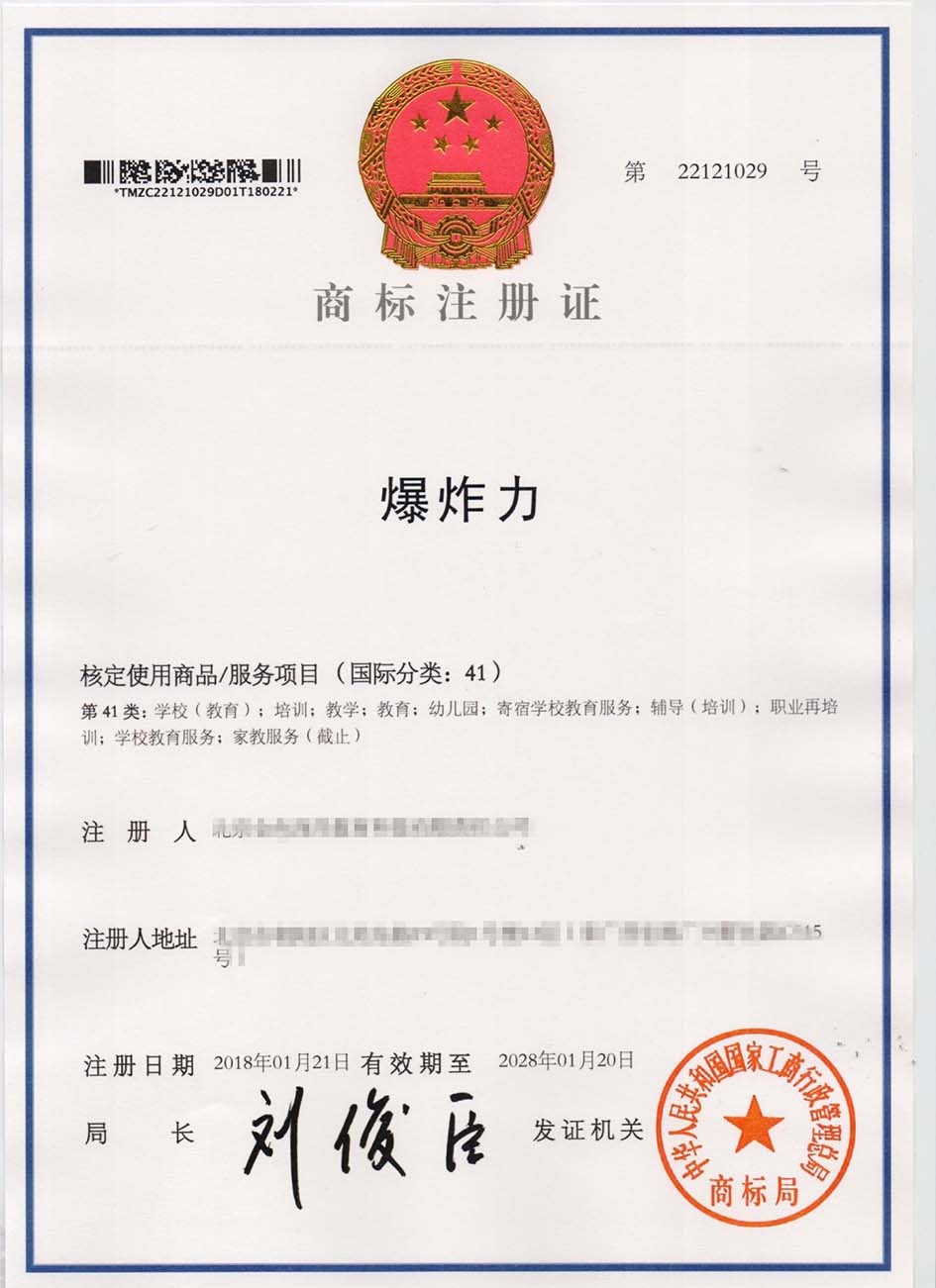 第41类“爆炸力”商标注册证