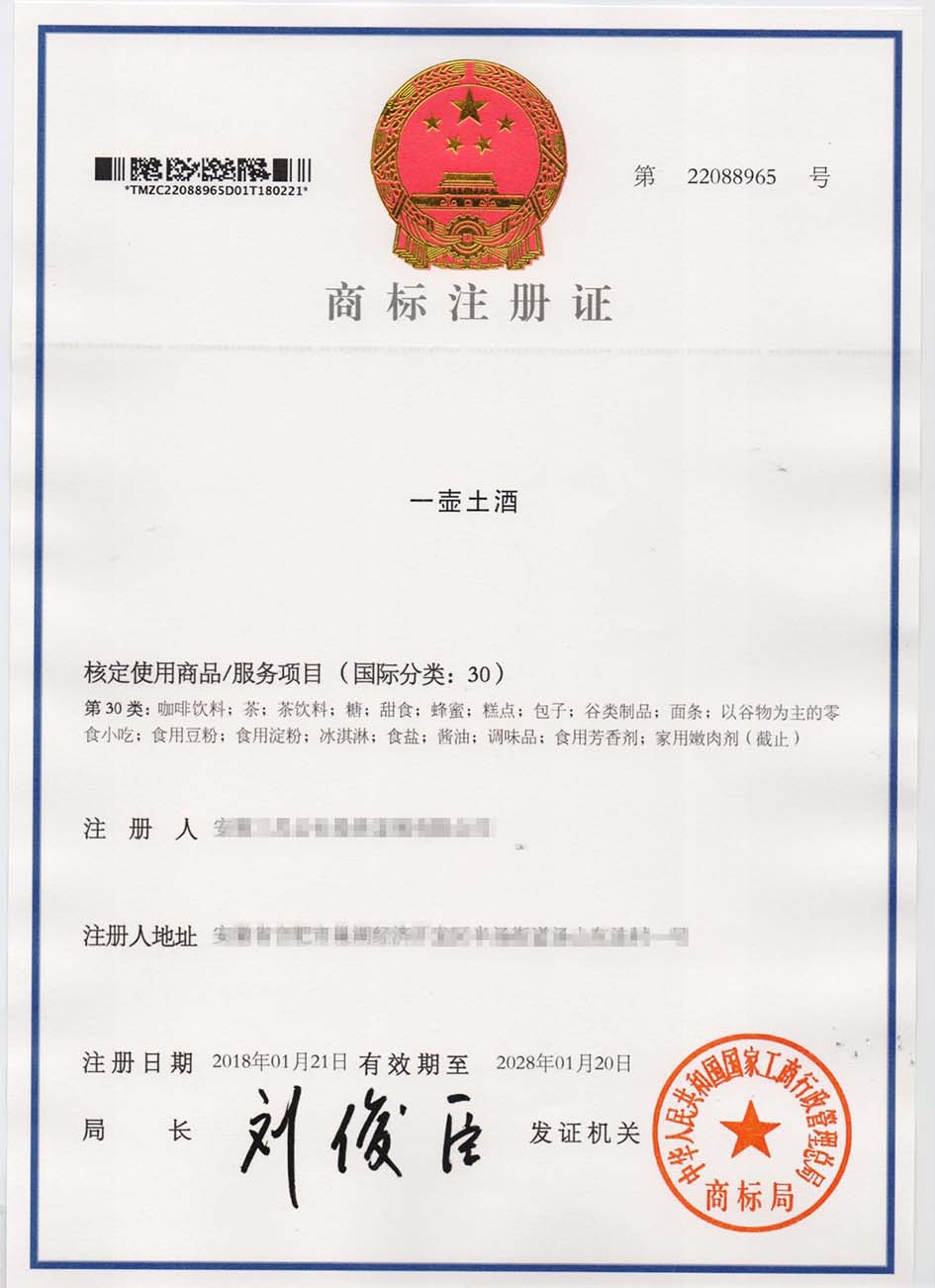 第30类“一壶土酒”商标注册证