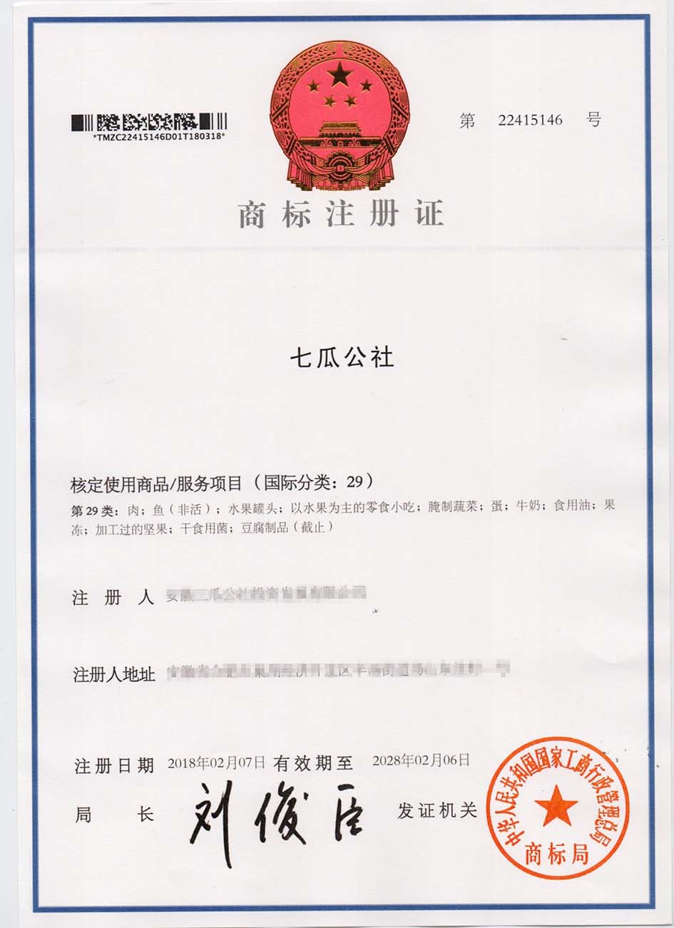 第29类“七瓜公社”商标注册证